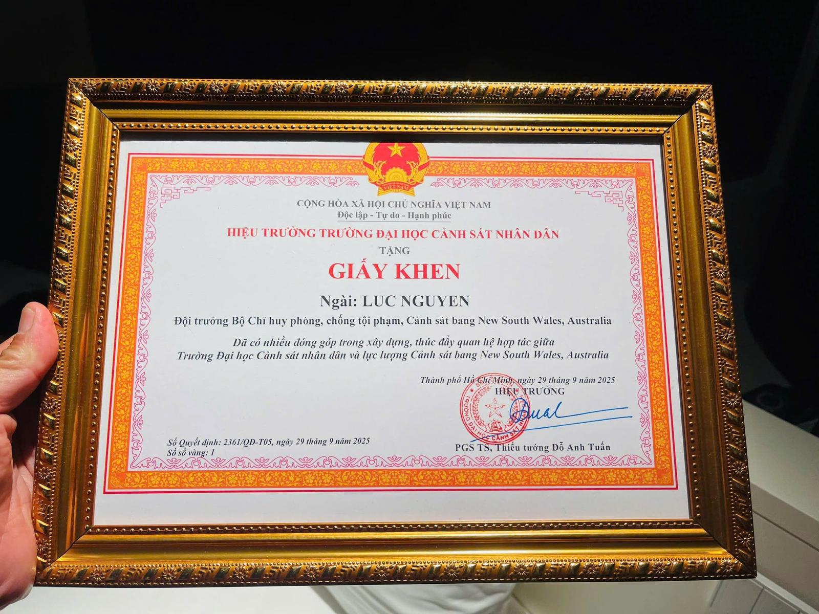 Special award presented to Luc Nguyen for his contribution to the Dept Foreign Relations, Ministry of Public Security by Deputy Police Minister Lt General Le Quoc Hung. Presented at the People’s Police University, Ho Chi Minh City